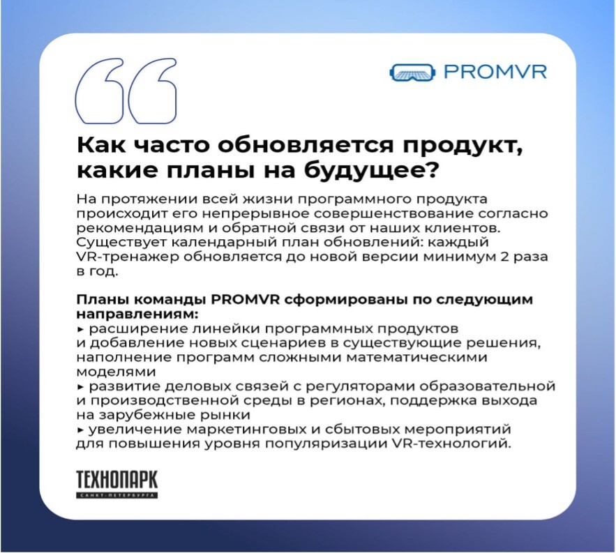 Компания PROMVR стремится к развитию и последовательно совершенствует продукт, опираясь на мнение профильных специалистов и запросы своих клиентов, что помогает сохранять лидирующие позиции в сегменте решений на базе смешанной реальности для профессионального образования и промышленности.