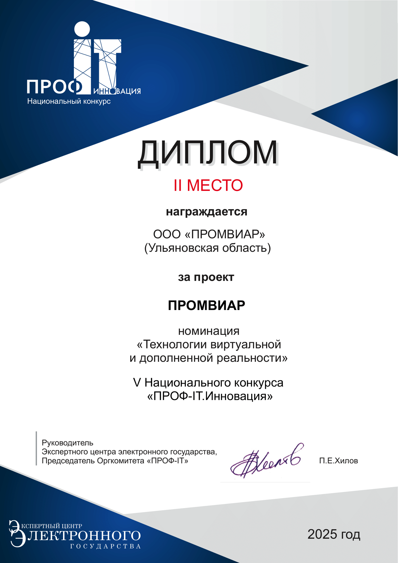 Уже второй год подряд компания «ПРОМВИАР» принимает участие в национальном конкурсе ИТ-решений «ПРОФ-IT.Инновация» в номинации «Технологии виртуальной и дополненной реальности» и входит в число финалистов. Конкурс направлен на выявление и популяризацию инновационных решений в области цифровизации, которые могут быть использованы в государственном и муниципальном управлении.