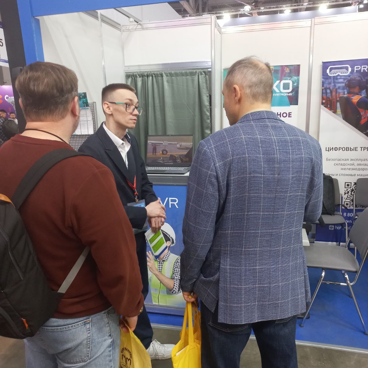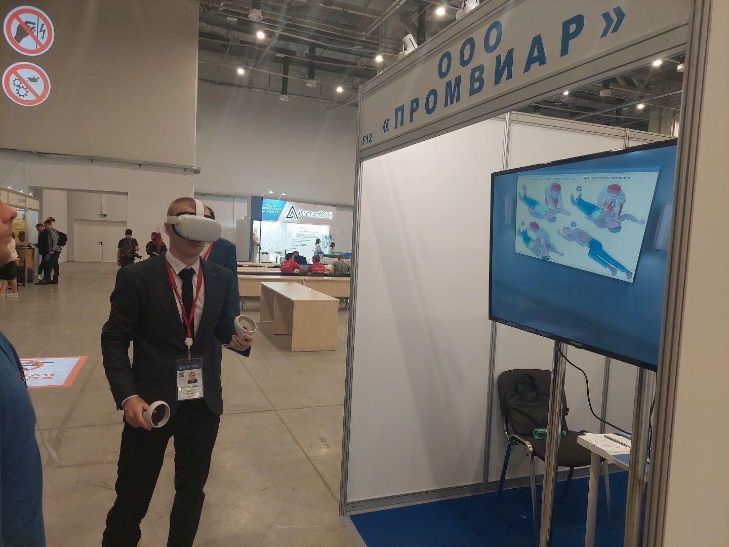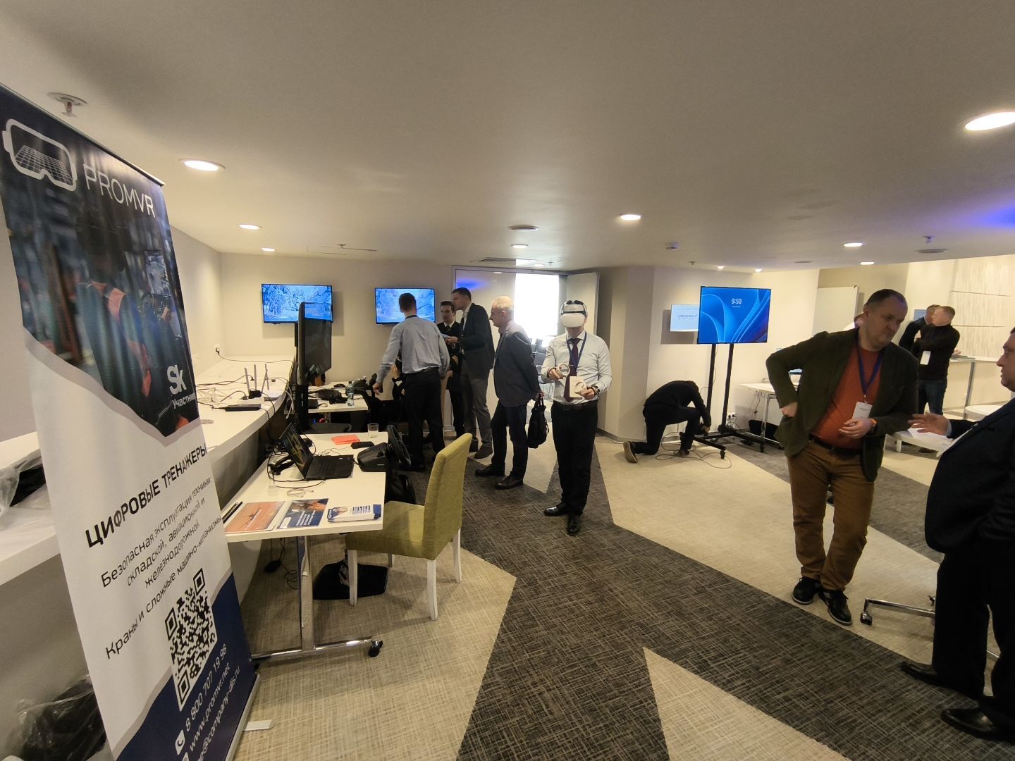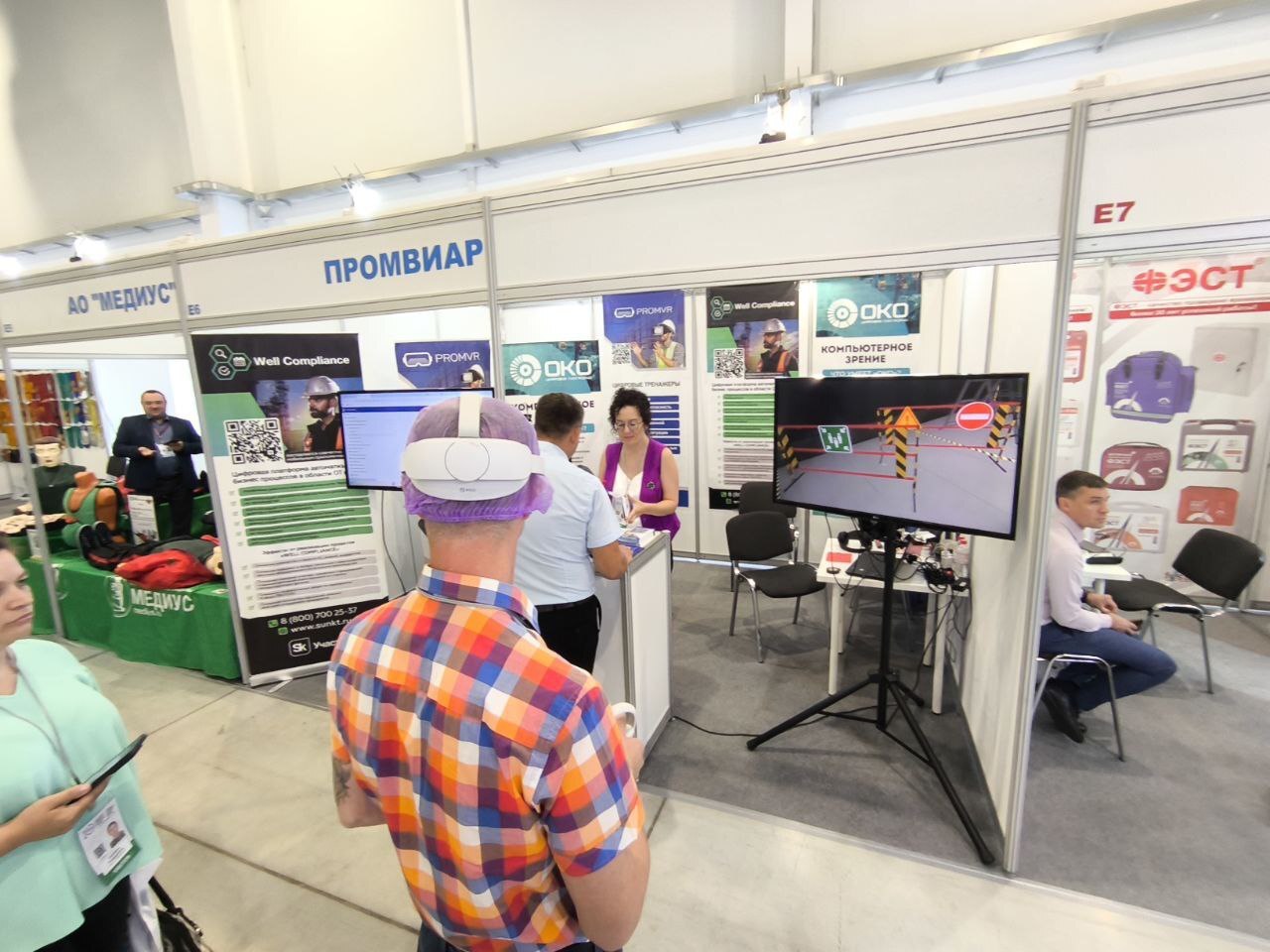Также работал наш стенд, где каждый желающий мог увидеть в действии VR-тренажёры для промышленности. Они значительно ускоряют и упрощают обучение технике безопасности при проведении самых разных работ повышенной опасности: на высоте, на погрузчике, сварочных, такелажных; учат правильно оказывать первую помощь пострадавшим, отточить правильный набор действий при пожаре, замечать потенциально опасные ситуации на объекте.