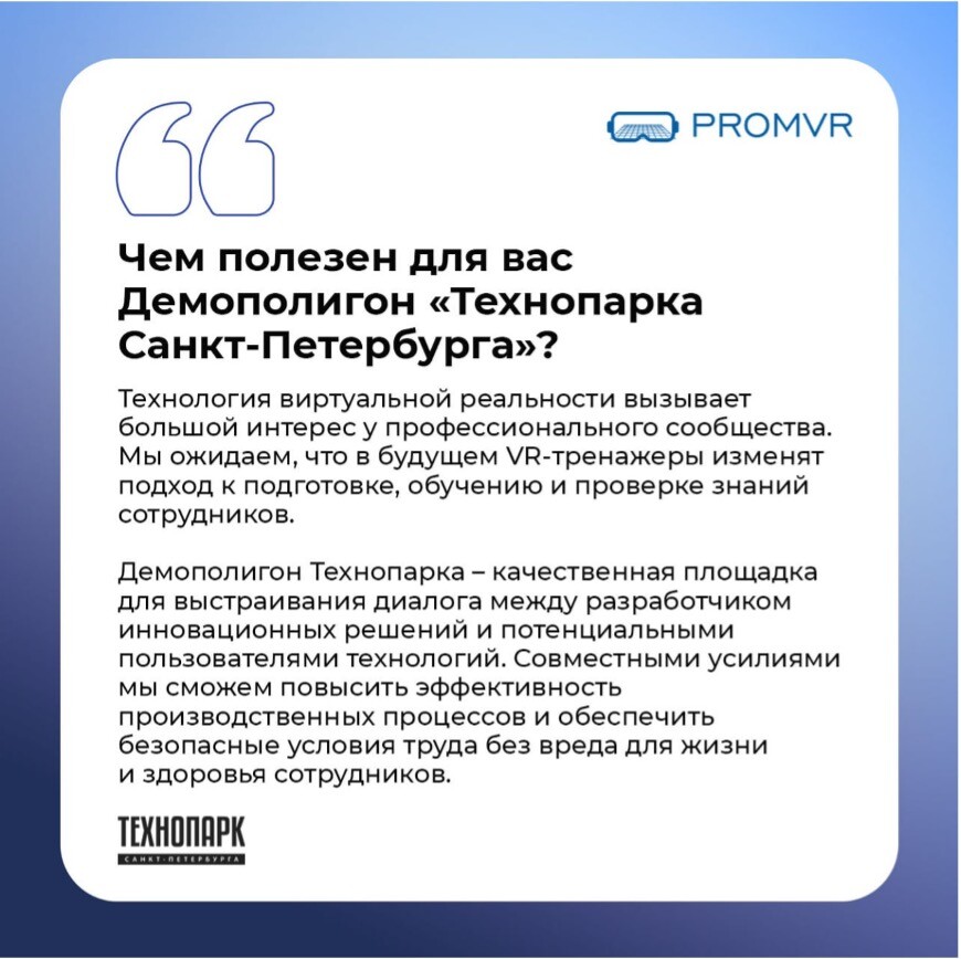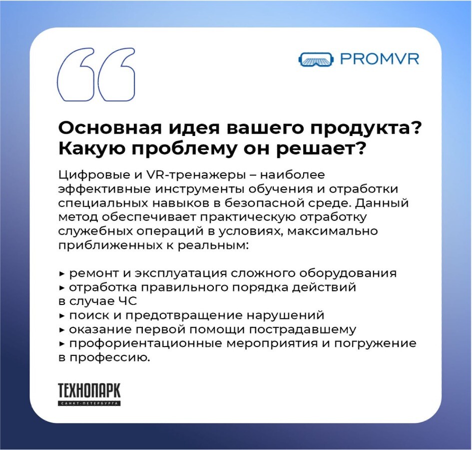Участие в данном мероприятии еще одно доказательство того, что универсальные VR-тренажеры, разрабатываемые компанией "ПРОМВИАР" могут применяться повсеместно и подходят большинству организаций для целей обучения, проверки знаний и повышения квалификации.