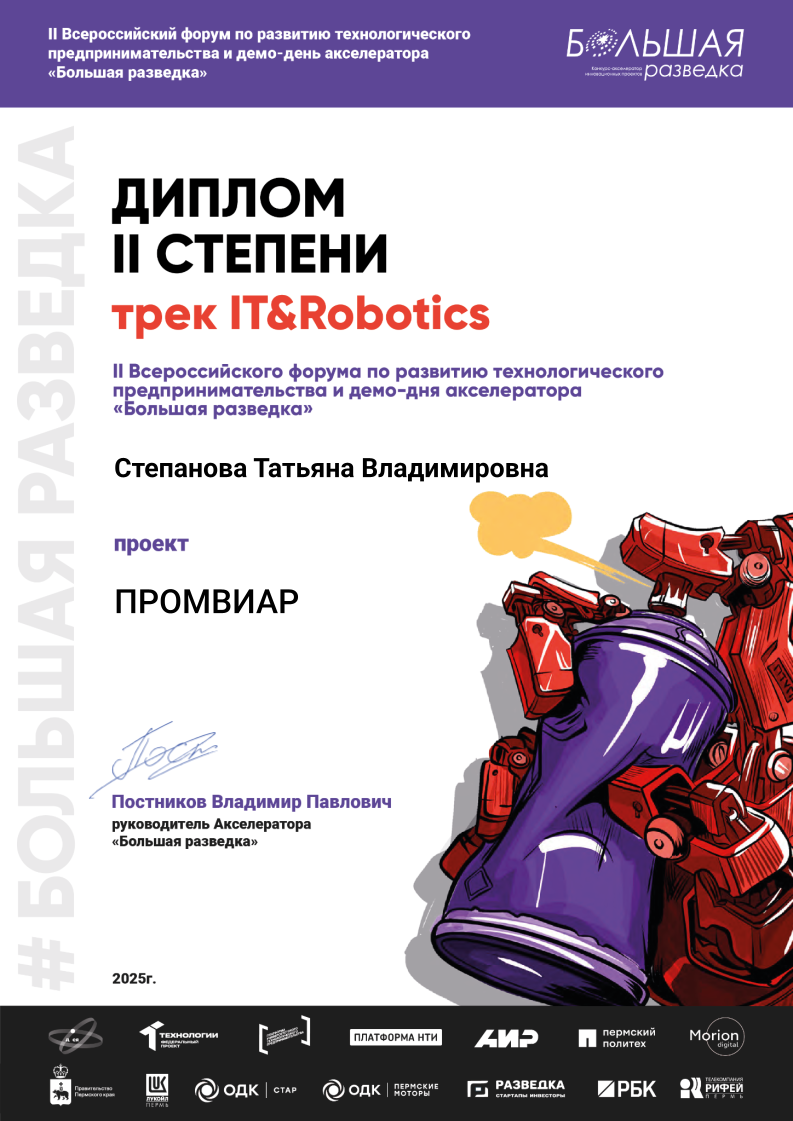 Мы рады поделиться важным для нашей команды событием: компания ООО «ПРОМВИАР» заняла 2-е место в треке IT&Robotics на финале всероссийского конкурса-акселератора инновационных проектов «Большая разведка 2025», который состоялся 14 ноября в технопарке Morion Digital.