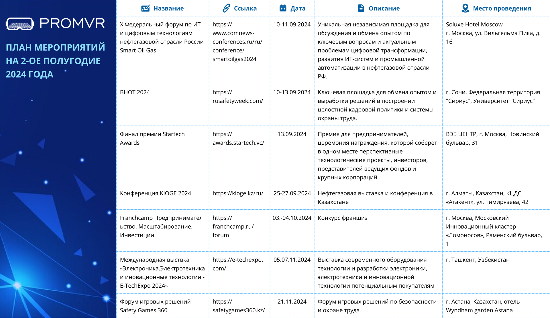 В 2026 году ПРОМВИАР примет участие в крупнейших российских и международных выставках и форумах в области охраны труда, промышленной безопасности и высоких технологий. На площадках мероприятий мы представим VR- и MR-тренажеры и продемонстрируем их практическое применение.