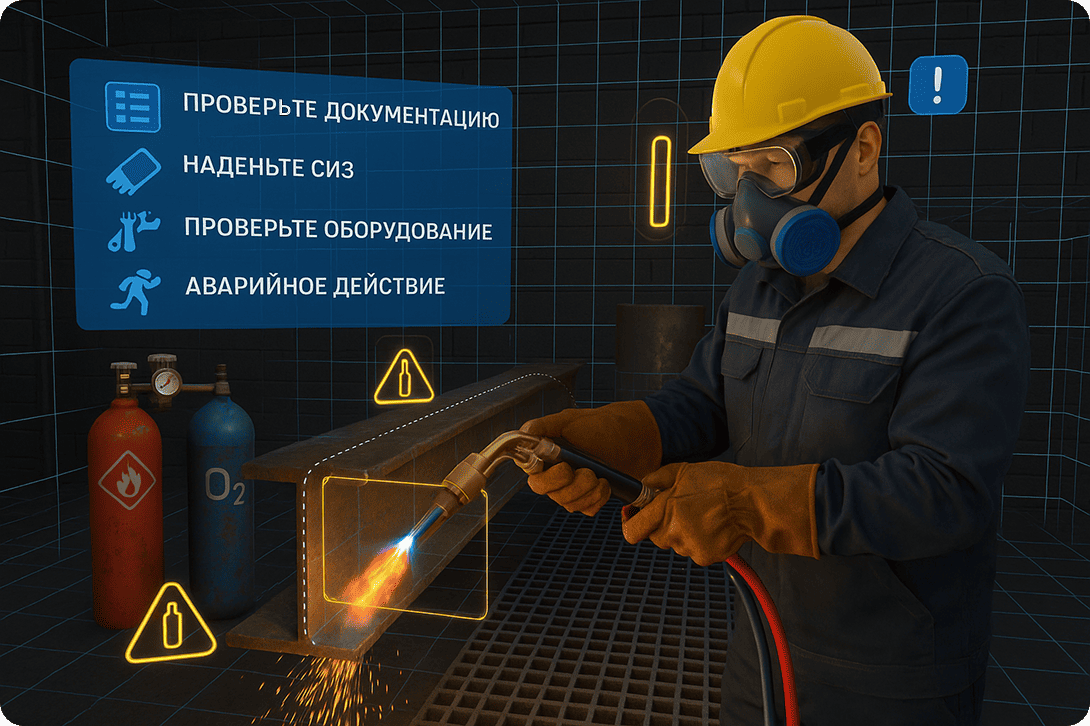 В процессе использования данного VR-тренажера пользователь приобретает навыки по безопасному выполнению огневых работ электрорезательных и газорезательных: