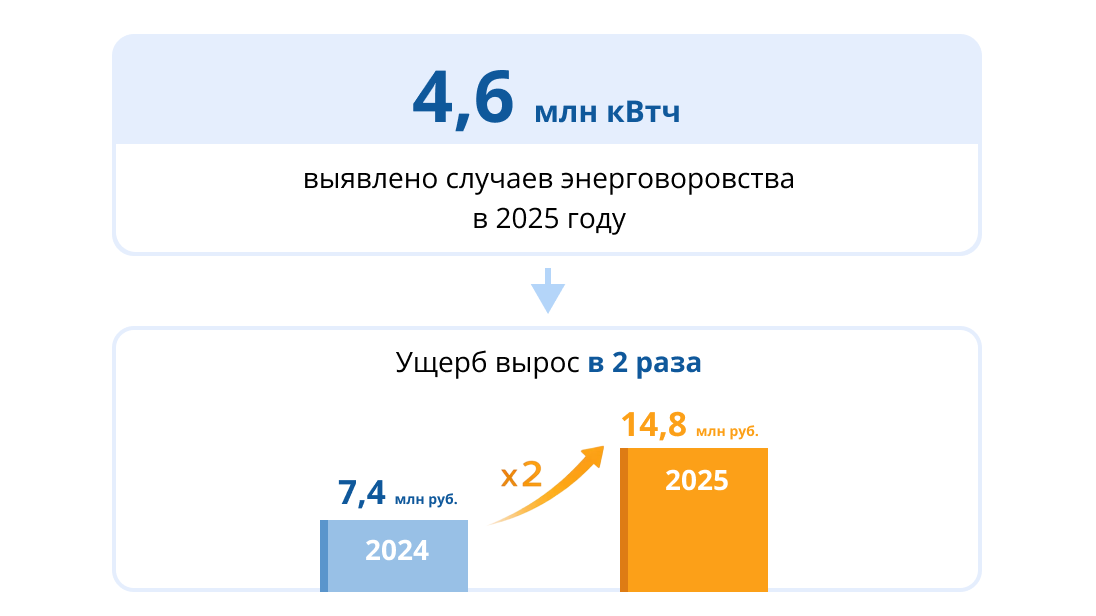 Специалисты компании "Россети Тюмень" в 2025 году обнаружили энерговоровства в суммарном объеме 4,6 млн киловатт-часов. Причиненный правонарушителями ущерб вырос в два раза по сравнению с 2024 годом и оценивается в размере 14,8 млн рублей.