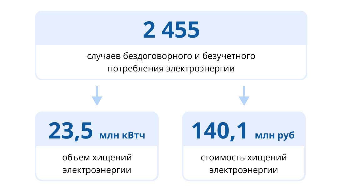 Объем обнаруженных хищений электроэнергии составил 23,5 млн кВтч стоимостью 140,1 млн рублей.