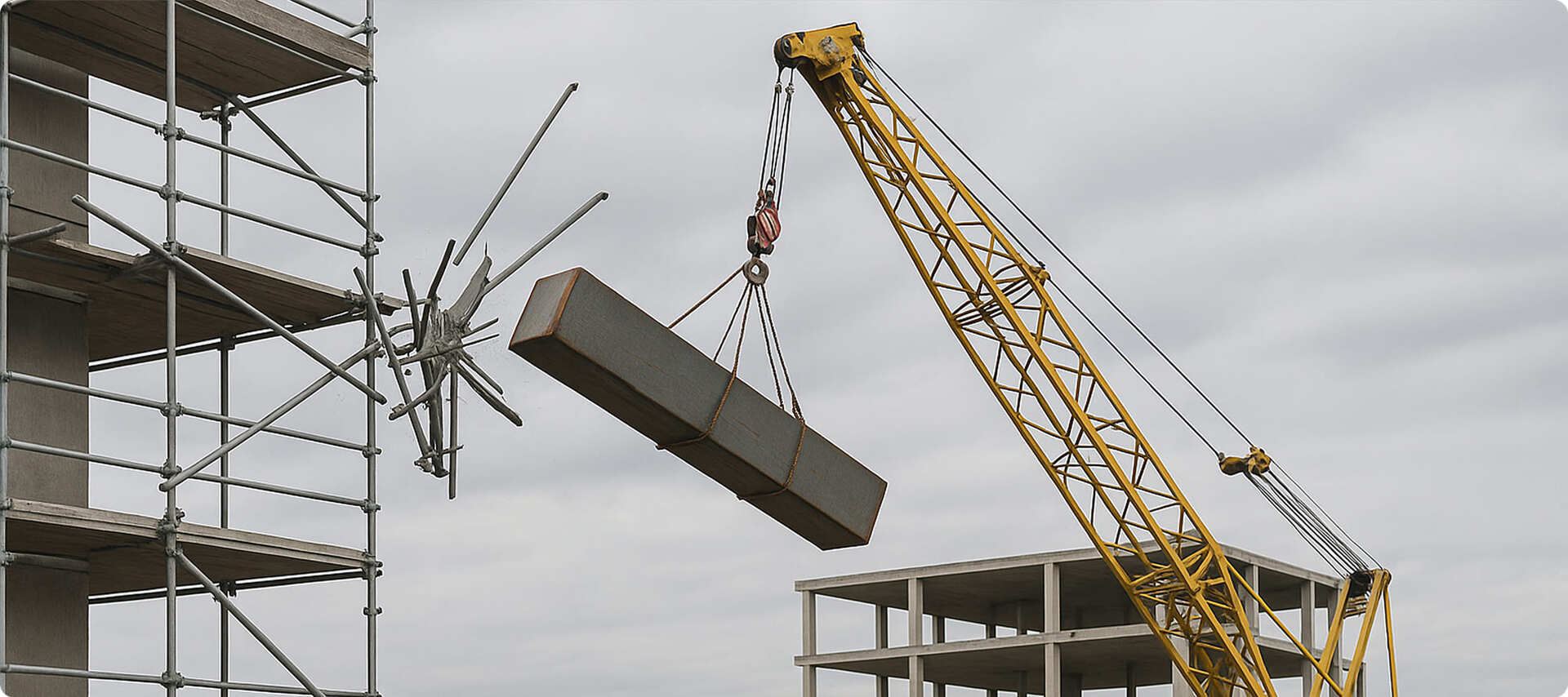 На стройплощадке во время установки металлической фермы стреловой кран не был правильно выровнен, и в момент подъема стрела отклонилась. Из-за раскачивания груз задел леса и упал с высоты 4 метров. Повреждена конструкция, травмирован стропальщик.